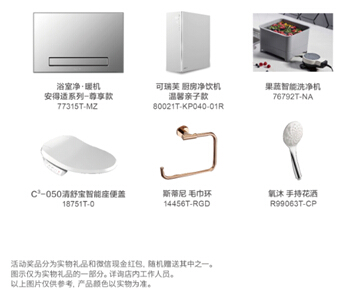 1. 线上扫码,参与解密游戏:关注“科勒KOHLER”官方微信,参与科勒中国20周年“密室寻宝”活动,至红星美凯龙科勒展厅签到,即有机会获赠以下奖品: