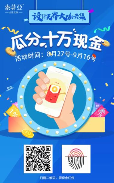 8月27日-9月16日关注索菲亚全屋定制公众号,立即获得三次摇一摇机会,十万奖金等你瓜分,定制家具又又又能省一笔!