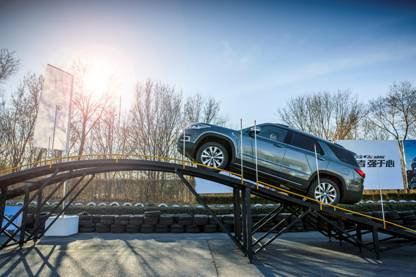 36%的斜坡,角度约20°,高度约2.3米,且坡道上设有交叉轴滑轮组,这样的低摩擦驼峰测试对于长安CS95来说,不仅考验车辆的爬坡能力,也考验车辆的四驱性能和其他辅助功能。而在博格华纳智能适时四驱系统有效分配制动力的作用下,长安CS95在爬坡时可实现扭矩传递达到2000 N·m的强大牵引性能助力其轻松上坡;而坡道中段时,上坡辅助系统会及时工作,并保证车辆顺利通过坡道,下坡时可以启动HDC智能变速陡坡缓降系统,时速8-35公里之间,实现变车速控制。