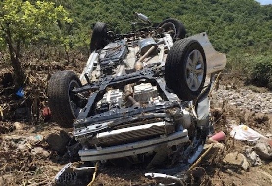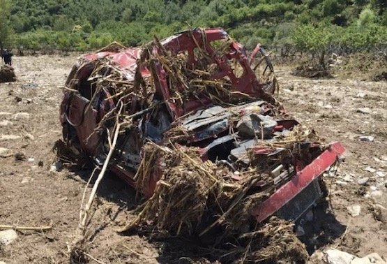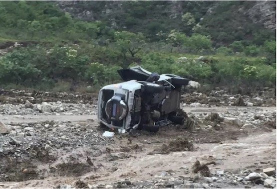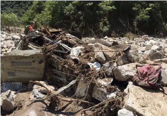 而另一辆车,这位车友这样记录到:“我们车队第一辆被冲走、也被冲得最远的一台车也被找到了,但这台车上的四个人却没有那么幸运,光看照片已经看不出这是什么车了。上面也都被大石头所覆盖(起亚索兰托),只能感叹天灾面前我们是那么的渺小。”