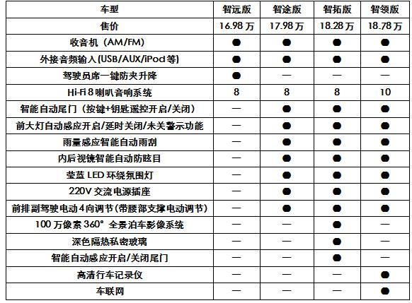 CS95的两驱共有6个版本,除去2款5座车型,还有智远版、智途版、智拓版、智领版4个版本。从下面这张图我们就能明显的看到售价和配置差异:
