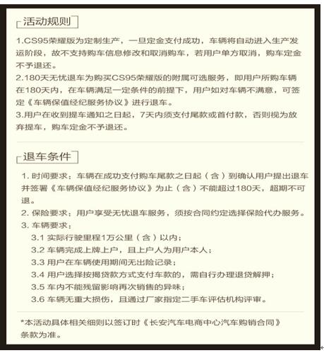 CS95荣耀版里里外外都好,但花10多万买车还是有点顾虑怎么办?别担心!CS95荣耀版强心承诺“180天无忧退车”,凡是在购车时勾选了“180天无忧退车”服务,在180天以内且满足厂商对退车的“车辆要求”,消费者就可以按照自己的意愿按购车发票原价退车。