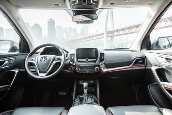 车内设计CS55也不走寻常路,别出心裁的采用了X元素太空座舱系统。X型中控设计如机翼般蓄势欲飞,带来迷人的视觉冲击,仿佛下一刻就将踏上一场星海间的旅行。座舱内,主色为黑与红,强烈的色彩碰撞,使车舱内充满跃动,动感无限。