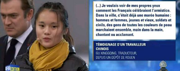 同时,法国一所国际学校8名法国高中生朗读了6段记录一战停战日场景的文字,从平凡人的视角展现百年前人们对和平的渴望,其中一篇书信出自一位中国劳工之手,这也是一战中国劳工这一特殊群体首次在法国国家层面的一战纪念活动中获得承认。