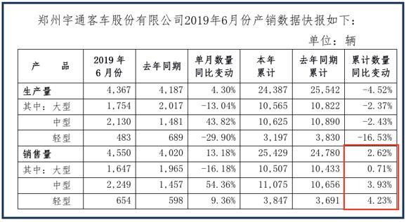 7月3日,宇通客车发布2019年6月份产销数据快报显示,2019年6月,宇通客车销售4550台,单月同比增长13.18%.1-6月累计销售客车25,429辆,同比增长2.62%。其中,大型客车累计销量为10,507辆,同比增长0.71%;中型客车累计销量为11,075辆,同比增长3.93%;轻型客车累计销量为3,847辆,同比增长4.23%。