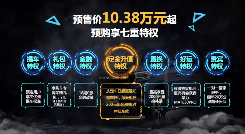 第一重特权为“定金升值特权”即从定车日起至通知提车日,每天返还200元现金,交车时冲抵车款;第二重“金融特权”:18期0息金融政策;第三重“置换特权”:最高享受2000元置换补贴;第四重“礼包特权”:享购车专属荣耀礼包,礼包于提车当天发放;第五重“好运特权”:获得抽奖机会,更有机会获得华为MATE 30 PRO;第六重“提车特权”:预定用户享受优先提车权益;第七重“贵宾特权”:一对一管家服务及4年20万公里超长质保。