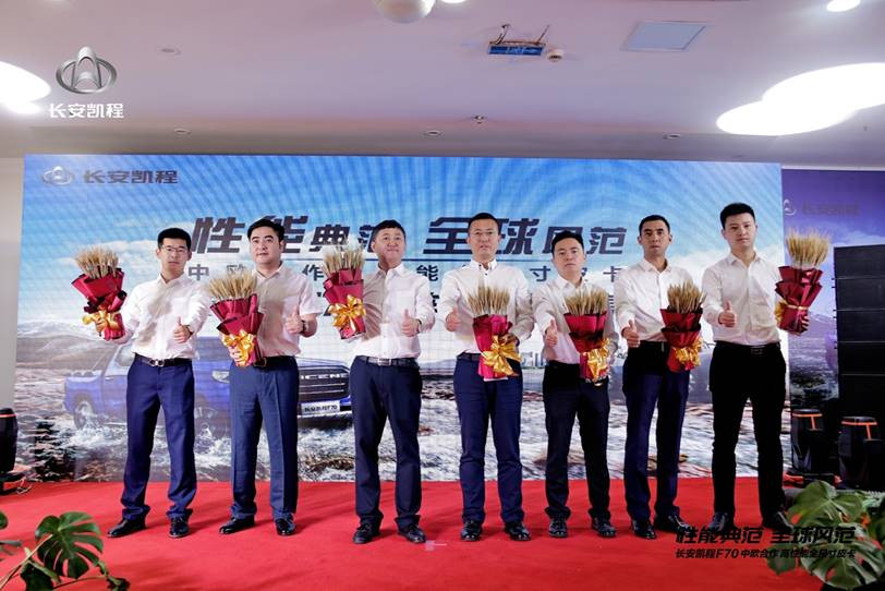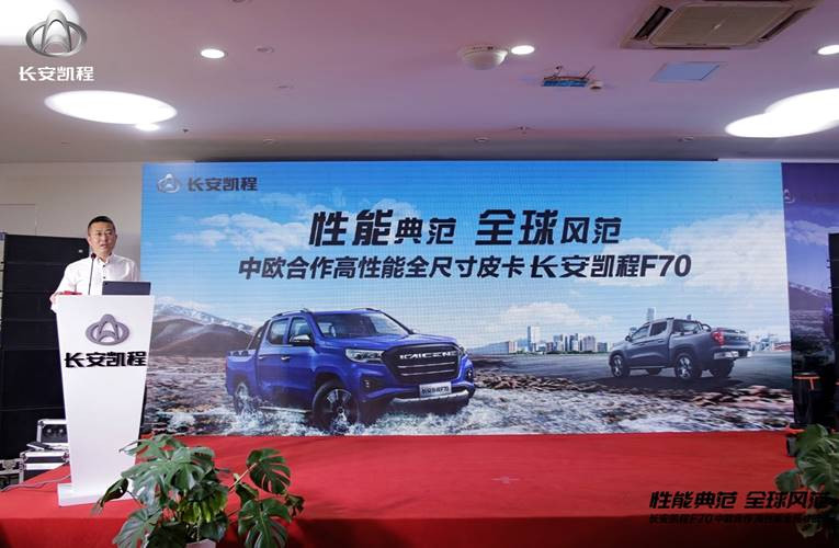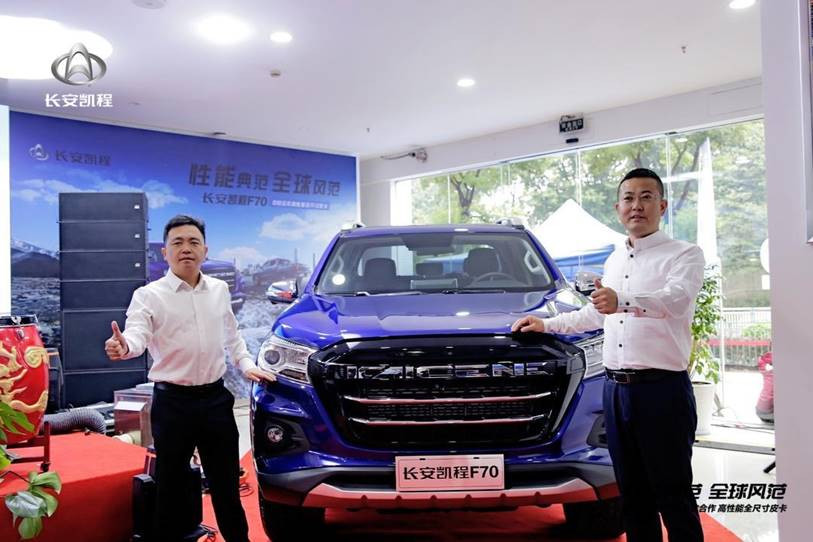 2019年10月10日10:10,以“性能典范 全球风范”为主题的中欧合作高性能全尺寸皮卡长安凯程F70实车到店暨预售开启活动在重庆举行。长安凯程事业部营销中心总经理李福龙、长安凯程事业部研发中心主任兼长安凯程F70项目总监雷应锋、长安凯程事业部营销中心皮卡营销经理路遥等长安凯程领导及长安凯程经销商、用户代表、全国媒体代表,共同开启了长安凯程F70的全国预售,预售价10.38万元起。