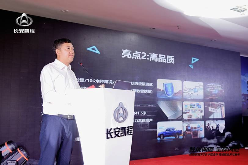 在活动现场,长安凯程事业部营销中心皮卡营销经理路遥对长安凯程F70进行了详细讲解,并公布了让皮卡用户屏息以待的长安凯程F70预售政策,即用户自2019年10月10日至上市,通过长安凯程F70经销商店支付定金10000元人民币,即可享受七重特权。