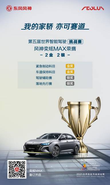 2021年5月22至23日,东风风神奕炫MAX在2021世界智能驾驶挑战赛(WIDC)中,荣获紧急制动科目金奖、车道保持辅助科目金奖、驾驶辅助赛银奖、落地先行赛银奖。
