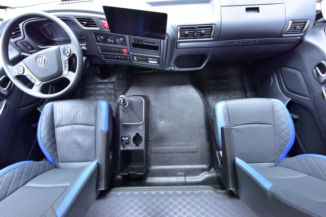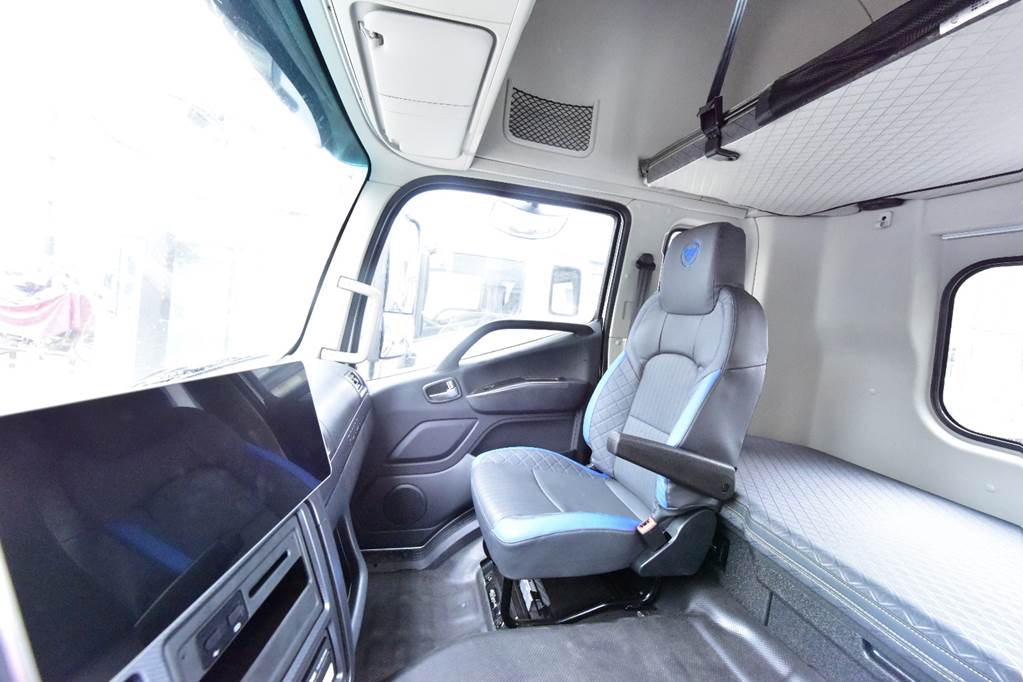 整车采用四点全浮气囊配置,乘坐舒适性、操稳平顺性更优;平地板设计,释放出更多的生活空间,让司乘人员在车内活动更加方便;主驾驶配备多功能可多向调节航空座椅,全面提升司机驾驶舒适度。驾驶室后围采用凸后围设计,有效提升卧铺空间,下卧铺宽度达到940mm,满足两人同时躺卧休息。此外,人机交互、多媒体大屏、360度全景环视、电子驻车等配置,全面提升整车驾乘舒适性,为卡友打造移动的家。