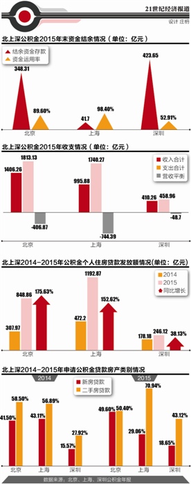 21世纪经济报道记者对比2014年以来北京、上海、深圳三地的公积金年报数据发现,2015年京沪两地公积金贷款发放额同比暴增近3倍,上述三地2015年公积金均出现收不抵支的现象。而从结余情况来看,截至2015年末北京公积金结余资金活期存款仅4亿元,深圳仅100万元,上海为零。