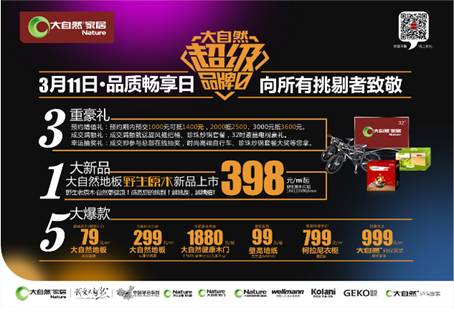 2月20日至3月11日,大自然家居野生原木地板联合红星美凯龙举办以“超级品牌日”为主题的活动,产品的升级配上红星美凯龙顶级购物体验,放心之余更赠贴心。大自然野生原木地板期间推出的印茄系列,革新了印茄传统色调,开创行业印茄本真色,AA级浅色选材,做到真材实料;圆你的高端户外、阳台、入户花园的梦想。听说还有3重豪礼赠送,32吋液晶电视等你来拿,赶快参与,3月11月截止哦!