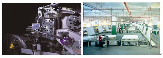 各车间生产线均为先进精密机械,譬如:美国礼恩派床垫生产线,德国BURKLE(贝高)三聚氰胺压机 ,奥地利Schelling(谢林)纵横锯,德国IMA四端封边设备 ,德国MAW数控排钻 ,德国Ligmatech 自动化包装生产线等。