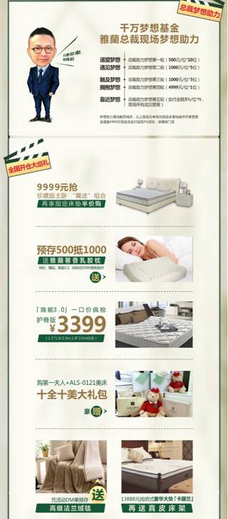 雅蘭床垫51周年国庆开仓盛典精彩多多,与您分享。大奖多多,豪礼多多。4999元总裁助梦基金,霸道送!预存购物500抵1000,豪送馨香乳胶枕。新品首发,爆款呈现51周年特别定制的卧室珍藏组合“蘭·途” [蘭颂51th] 美式豪华弹簧乳胶床垫+[侣途]进口真皮实木皮床,这等豪华的配置首次亮相即以极具诱惑力的情怀价呈现世人。全场爆款,惊喜不断:诸如购享欧式奢华大垫「卡丽兰」免费送皮床;疯抢卧室劲销组合[第一夫人] 星级宫廷奢华大垫+[奥斯汀] 纯正英伦风情皮床,任性送梦幻大礼包。——千载难逢的钜惠奉献,精彩不容错过。