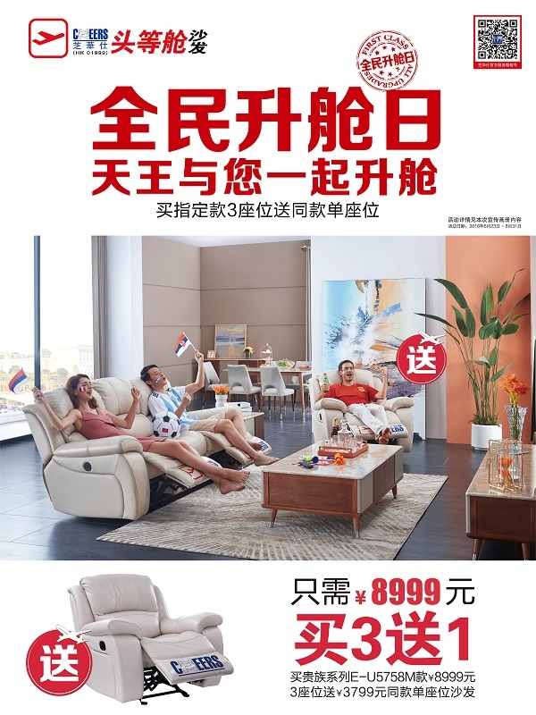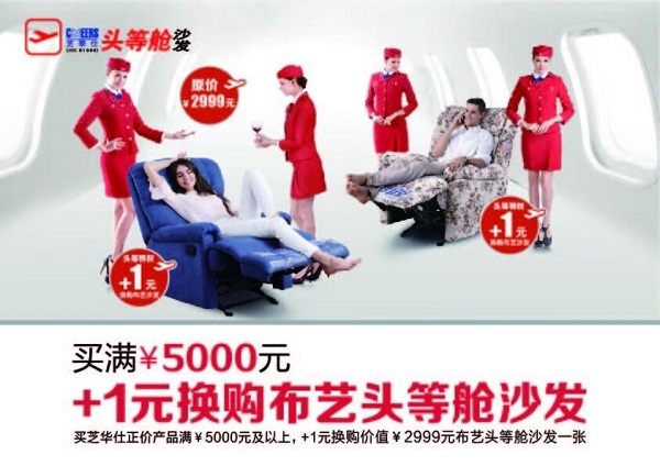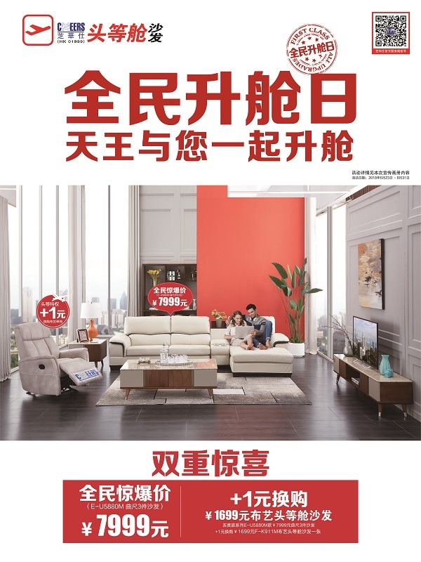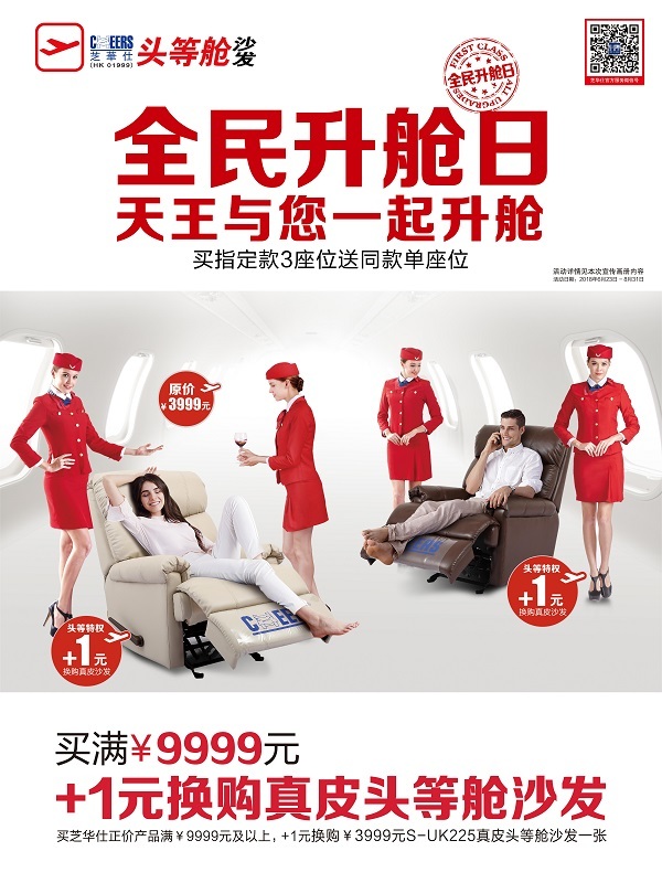 怎么升舱?即日起至8月31日,加1元就能换购头等舱功能沙发!