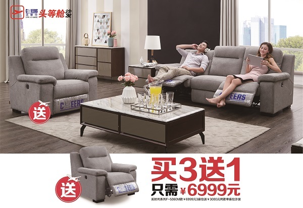 除了1元升舱换购外,还有沙发“买三送一”活动。买芝华仕贵族系列E-U5758M 3座位沙发¥8999元送¥3799元同款单座位沙发;买芝华仕时尚系列F-5360M 3座位沙发¥6999元送¥3000元同款单座位沙发。