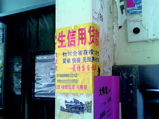 忽如一夜间,学生贷款的小广告遍布省城各大高校校园。记者近日走访山师、山财、山东工艺美院等多所大学发现,布告栏、长椅、宿舍门口等很多地方都贴有“大学生无抵押贷款”、“消费贷款”等小广告,上面的宣传标语和低息广告让人非常心动。