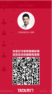 活动期间,TATA木门特邀静音大使田亮邀请你一同线上群聊,扫码进群聊,与田亮一道共享静音时刻。